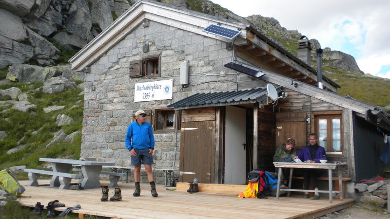 Auch hier helfen uns Schneefelder zu einem beschleunigten Abstieg zurück zu unserem Materialdepot am Mittlebärgpass. Angeseilt stapfen wir mit den Steigeisen linkshaltend über den eingeschneiten Hohsandgletscher und im nu haben wir, die im Vorfeld gefürchtete auf der Karte ziemlich verspaltete Steilstufe überwunden. Anscheinend wird diese Route nicht so oft begangen, denn wir erhielten kaum Informationen über die Verhältnisse. Die Hütten auf der italienischen Seite sind halt nicht unbedingt Bergsteigerhütten. Nach einem Gletscherwackel über den nun aperen und unverspaltenen Hohsandgletscher kämpfen wir uns auf ca. 2‘700m die steile Moräne hoch und treffen unerwartet auf Wegspuren, welche uns direkt zum schön gelegenen Rifugio Claudio & Bruno 2‘708m führen. Nach einer ausgedehnten Rast machen wir uns dann noch an den weiteren etwas schwerfallenden Aufstieg zum Rifugio 3A 2‘922m, wo wir übernachten werden. Ein Blick in den Passo dei Camosci und die Infos vom Hüttenwart verunsichern uns etwas die morgige Route. Deshalb unternehmen wir noch einen kurzen Ausflug via Madonna 3‘009m zur Skiliftbergstation damit wir die Route besser inspizieren können. Als wir oben sind, können wir 4 Personen im Abstieg durch das steinschlägige Couloir absteigen und befragen sie anschliessend über die Verhältnisse. Nur zu zweit sollte es machbar sein. So entschliessen wir uns es am nächsten Morgen zu wagen.