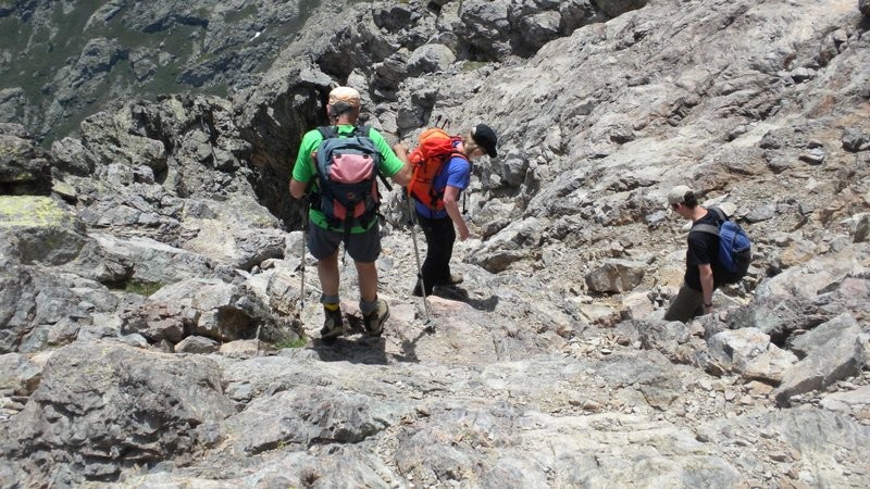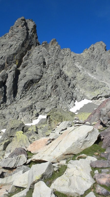 Punkten folgend, queren wir nun die Südflanke des Monte Cinto und gelangen so in stetigem auf und ab zum plattigen Bereich unterhalb des Gipfels, welchen wir in einfacher Kraxlerei überwinden und