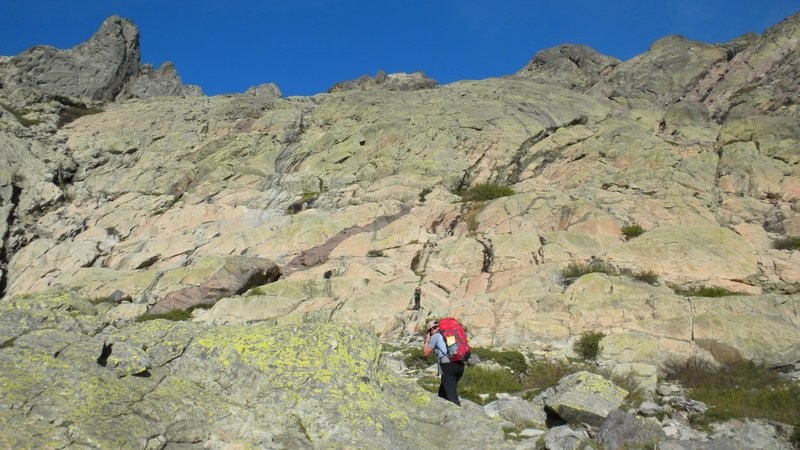 Aufstieg über die Gletscherschliffe zum schönen Lac du Cinto 2‘189m. Ab hier folgt ein etwas mühsamer Teil des Aufstiegs. Über das ziemlich lebendige steile
