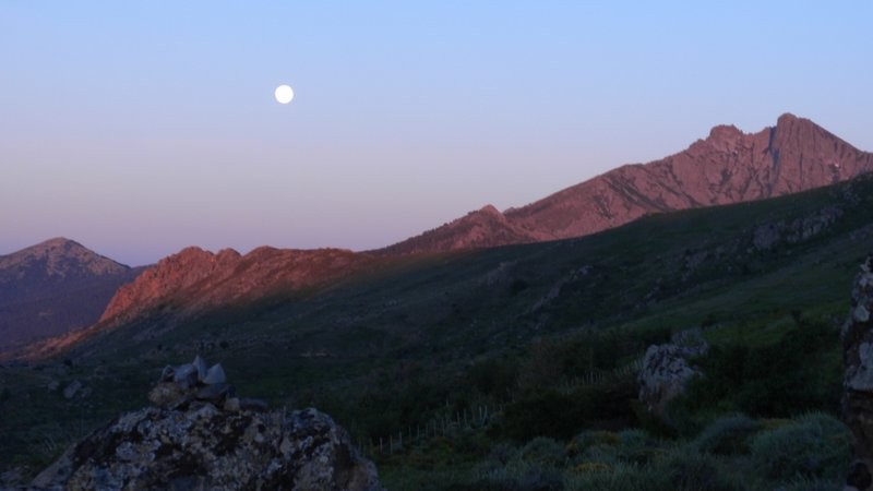 und betörend riechenden Ginster, vor uns der Vollmond und im Rücken der Sonnenaufgang…..so wandern wir genüsslich in aller Ruhe bis zum Refuge de l’Erco 1‘667m. Da es nach