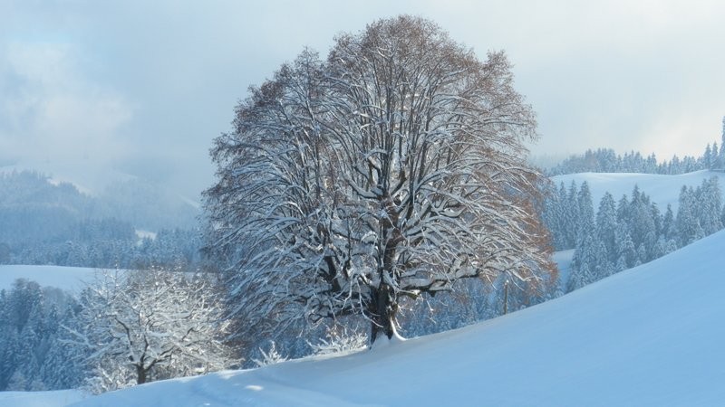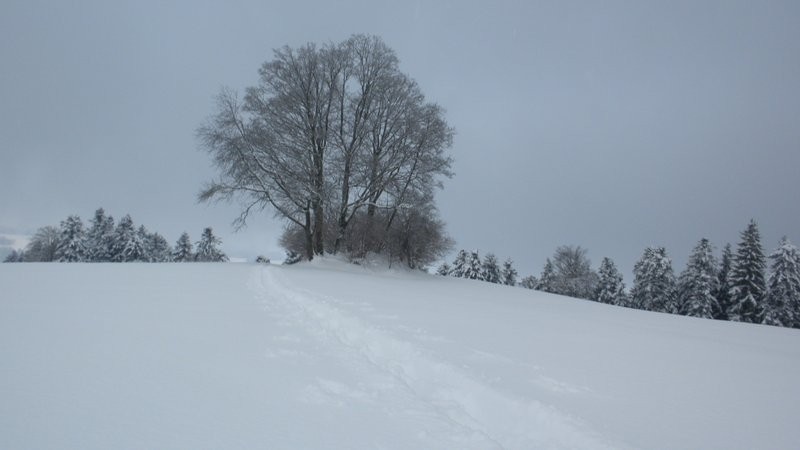 Bei der Käserei Ilfis in Langnau 673m geht’s los. Aufwärts über die offenen Felder via Tanne Richtung Zwigarte. Ab hier folge ich dem Wanderweg, welcher teilweise durch den tiefverschneiten Wald zur Wildmatt 980m hinauf führt. Nach der Howacht 1‘020m verlasse ich den Wanderweg und folge dem Waldweg durchs Mösli Richtung Vorder Scheideggli zu meinem lieb gewordenen und oft besuchten, aussichtsreichen persönlichen „Kraftort“ Hurnusser 1‘063m. Leider ist es heute kalt und zügig und auch die gemeldeten Aufhellungen sind dürftig. So mache ich mich bald wieder an den Abstieg. Zuerst geht’s über’s Feld hinüber zum Schürli bei Punkt 1‘067m, wo ich auf den Wanderweg stosse, welchem ich nun zurück zur Howacht folge. Von den schönen Linden oberhalb vom Bauernhaus Strick 1‘009m kann ich nun endlich über die schönen Pulverhänge hinunter gleiten. Immer auf der Hut vor zu steilen Hängen und den gefürchteten Fischmäulern, welche an den Gegenhängen überall gesichtet werden, gelange ich via Alteneischürli, ober – und unter Altenei, Brachli nach Langnau runter.