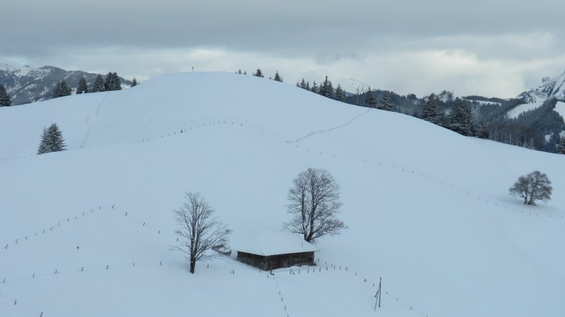 Eine kurze Rekotour unter widrigen Verhältnissen. Schon während der Anfahrt nach Schangnau 930m verschwinden die Aufhellungen und es giesst wie aus Kübeln. So warte ich bis der Regen etwas nachlässt und mache mich danach an den Aufstieg entlang des Wanderwegs via underi Rüti, underi Lamm nach oberi Rüti 1‘110m. Bis hier blieben die Schneeschuhe auf dem Rucksack, denn der Schnee wurde von den starken Regengüssen richtiggehend weggeschwemmt und viele Fischmäuler haben die Hänge frei gelegt. Durch den pflotschigen Schnee geht’s nun hinauf zur Meisenegg 1‘398m, wo mich der starke Westwind mit all seiner Stärke begrüsst. Es ist kühl, doch wenigstens scheint kurz die Sonne und motiviert mich zum Weiterweg auf den Wachthubel 1‘415m. In der Ferne braut sich der nächste Regenguss zusammen und so mache ich mich schnurstraks an den Abstieg über die schöne Egg via Chüng 1‘267m. An den steilen Nagelflühen geht’s vorbei, durch den Wald hinunter nach Schangnau, wo ich doch noch eine kurze Regendusche hinnehmen muss bevor ich wieder im Trockenen bin.