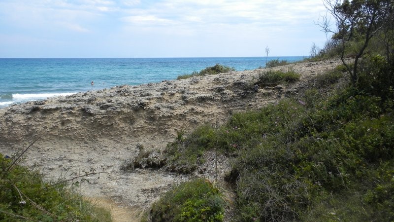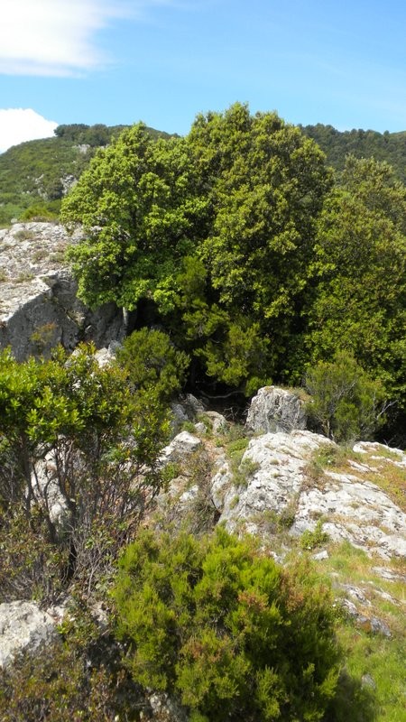 Rechskurve. Hier zweigt ein kleiner Pfad linkshaltend hinauf zur Aussichtskanzel Belvédère de Cervione 632m. Den spärlichen, roten Markierungen folgen wir über den teilweise