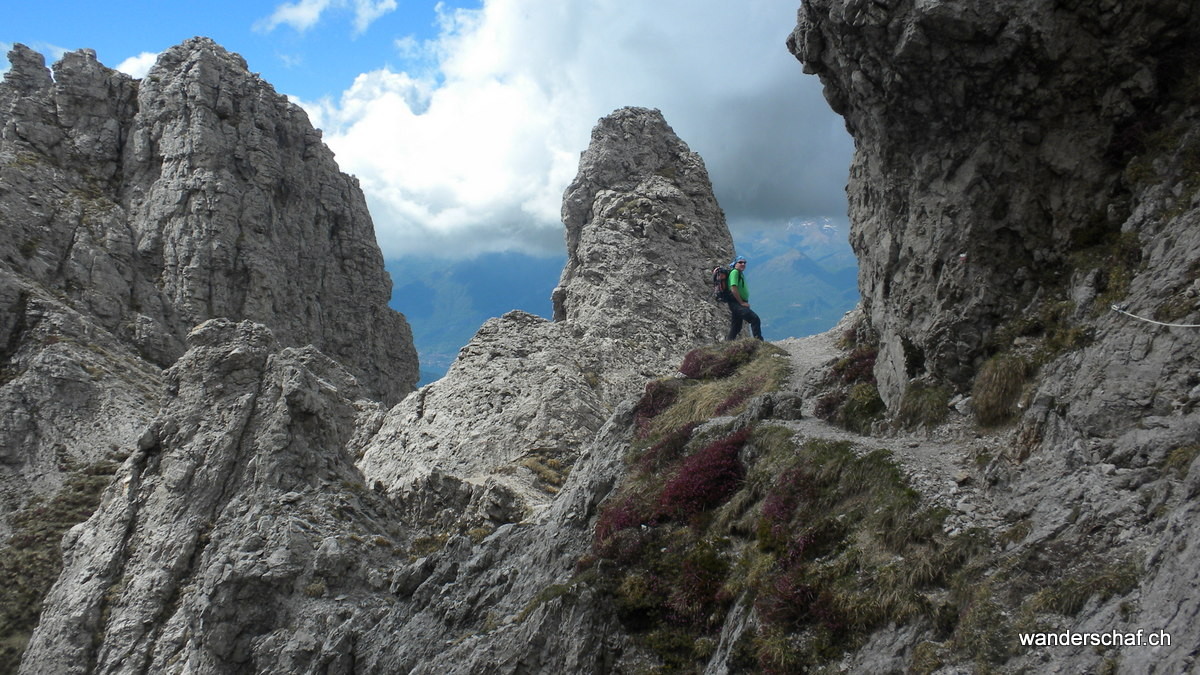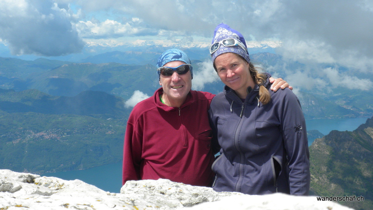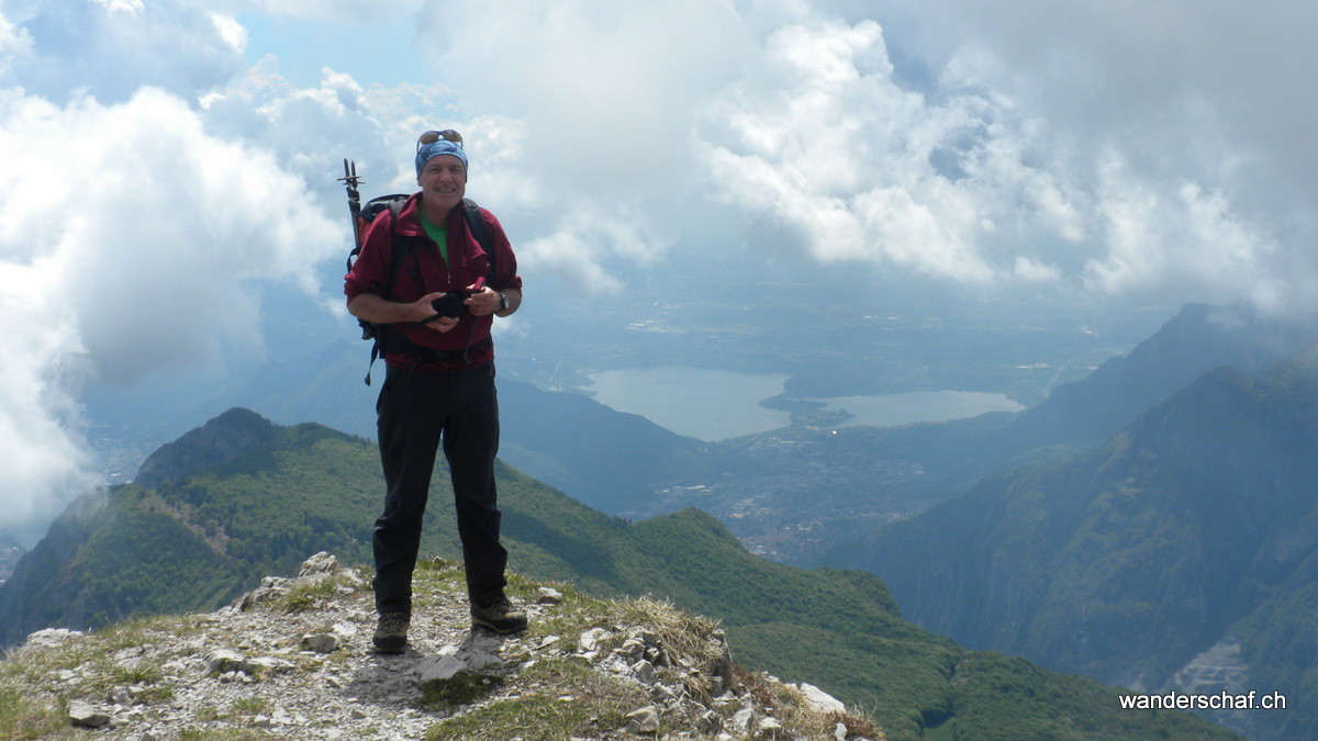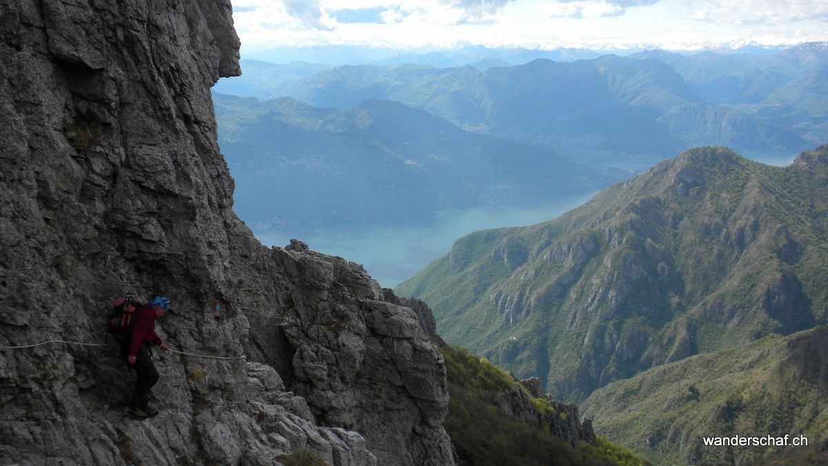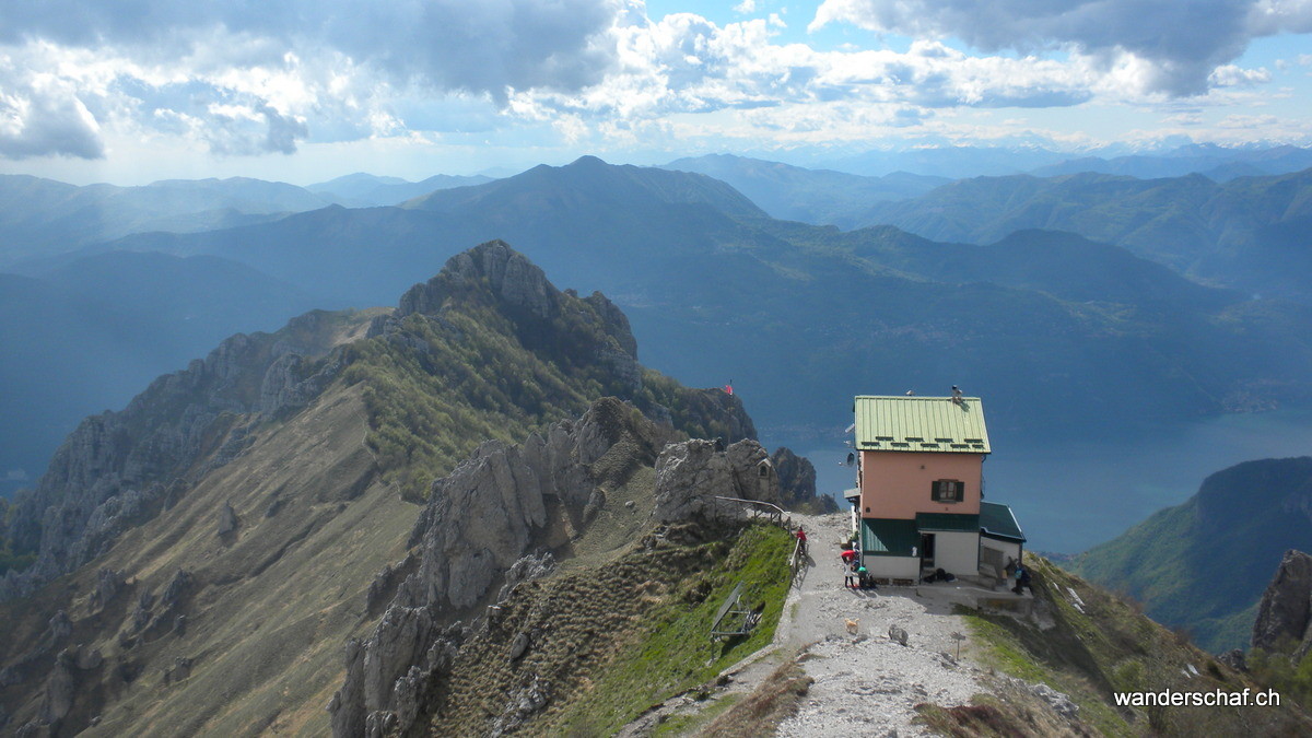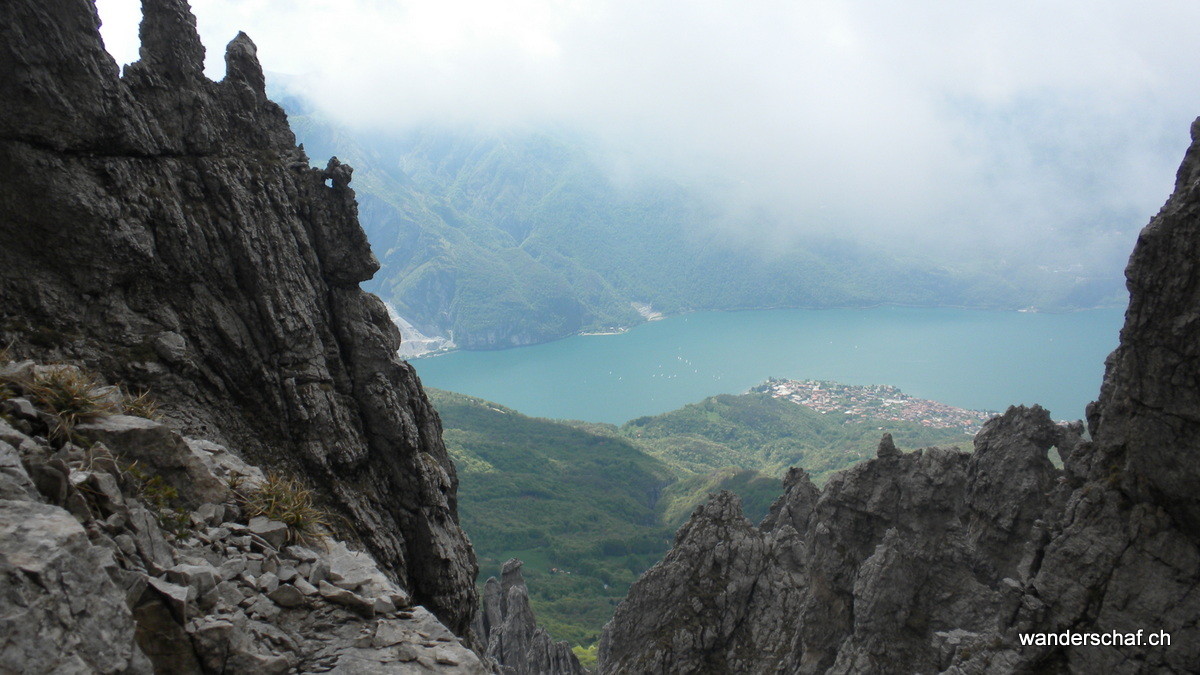 Am nächsten Morgen begrüsst uns die Sonne mit ihren wärmenden Sonnenstrahlen. Glücklich marschieren wir nach dem eher dürftigen, italienischen Weissbrot-Frühstück den bizarren Zacken der Grignetta entgegen. Für den Aufstieg wählen wir die Cresta Sinigaglia, wo wir schon bald die ersten Kommandos der vielen Kletterer, welche sich in diesem Gebiet rumtollen, vernehmen. Auch wir kommen noch zum Kraxeln, wobei uns einige Ketten den Aufstieg zum Gipfel der Grignetta / Grigna Meridionale 2‘184m erleichtern. Auch hier oben wimmelt’s nur so von Leuten, dennoch geniessen wir lange die wunderbare Aussicht auf den Comersee bevor wir uns an den Abstieg Richtung Sentiero Cecilia. Dieser anspruchsvolle, teilweise mit Ketten gesicherte und ausgesetzte Weg schlängelt sich durch die eindrücklichen Kalkzacken der Grignetta hindurch. Einige Zeit schauen wir den Kletterern zu, welche sich überall an den ausgesetzten Zacken genüsslich tun. Danach steigen wir zum herrlich gelegenen Rifugio Rosalba 1‘719m ab, von wo aus wir nach dem Einnachten auf das Lichtermeer der Grossstädte hinunter sehen können. Wir, als einzige Touristen, gehen unter in der feiernden und plagierenden Meute italienischer Kletterer und sind froh, das kleine 2er Zimmerchen für uns zu haben ;o)