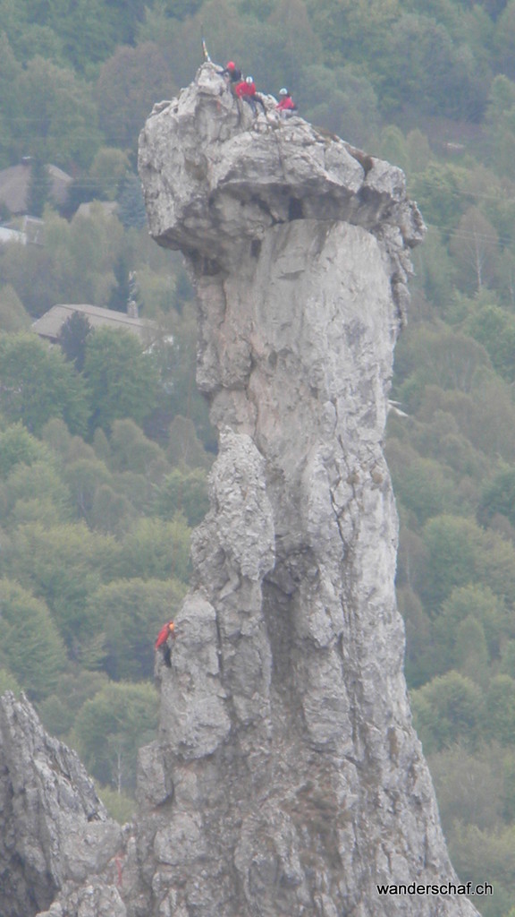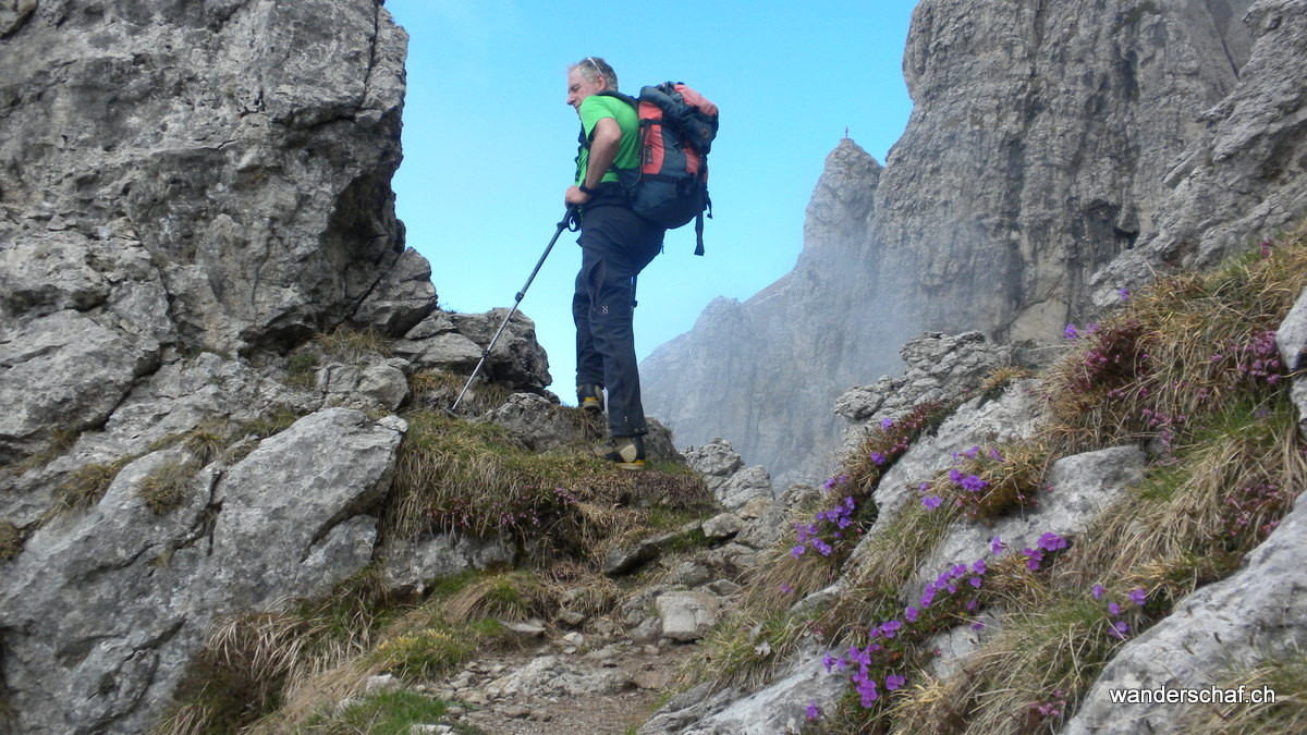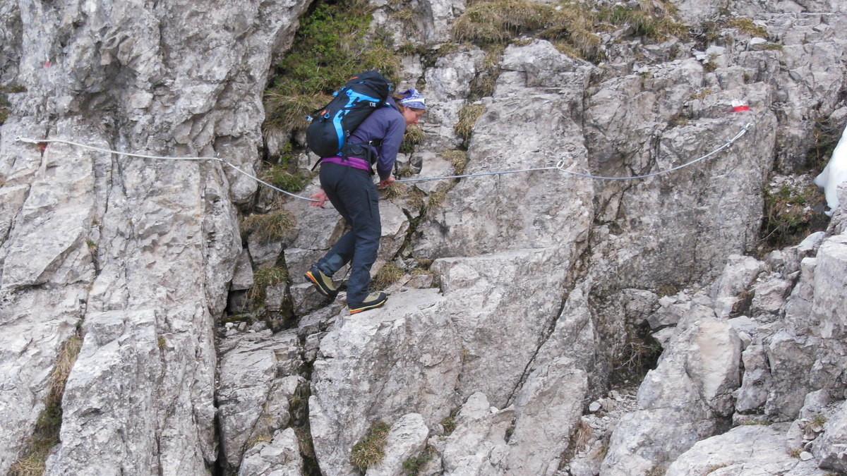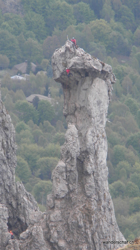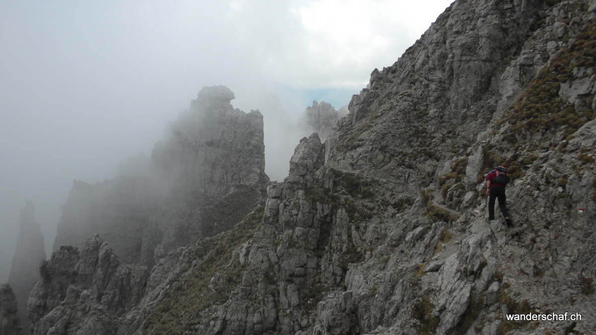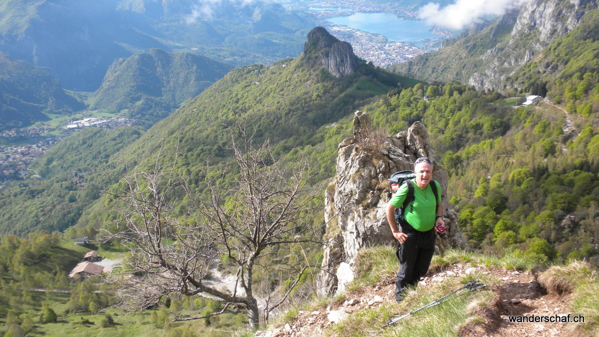 Am nächsten Morgen begrüsst uns die Sonne mit ihren wärmenden Sonnenstrahlen. Glücklich marschieren wir nach dem eher dürftigen, italienischen Weissbrot-Frühstück den bizarren Zacken der Grignetta entgegen. Für den Aufstieg wählen wir die Cresta Sinigaglia, wo wir schon bald die ersten Kommandos der vielen Kletterer, welche sich in diesem Gebiet rumtollen, vernehmen. Auch wir kommen noch zum Kraxeln, wobei uns einige Ketten den Aufstieg zum Gipfel der Grignetta / Grigna Meridionale 2‘184m erleichtern. Auch hier oben wimmelt’s nur so von Leuten, dennoch geniessen wir lange die wunderbare Aussicht auf den Comersee bevor wir uns an den Abstieg Richtung Sentiero Cecilia. Dieser anspruchsvolle, teilweise mit Ketten gesicherte und ausgesetzte Weg schlängelt sich durch die eindrücklichen Kalkzacken der Grignetta hindurch. Einige Zeit schauen wir den Kletterern zu, welche sich überall an den ausgesetzten Zacken genüsslich tun. Danach steigen wir zum herrlich gelegenen Rifugio Rosalba 1‘719m ab, von wo aus wir nach dem Einnachten auf das Lichtermeer der Grossstädte hinunter sehen können. Wir, als einzige Touristen, gehen unter in der feiernden und plagierenden Meute italienischer Kletterer und sind froh, das kleine 2er Zimmerchen für uns zu haben ;o)