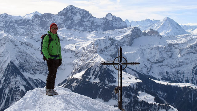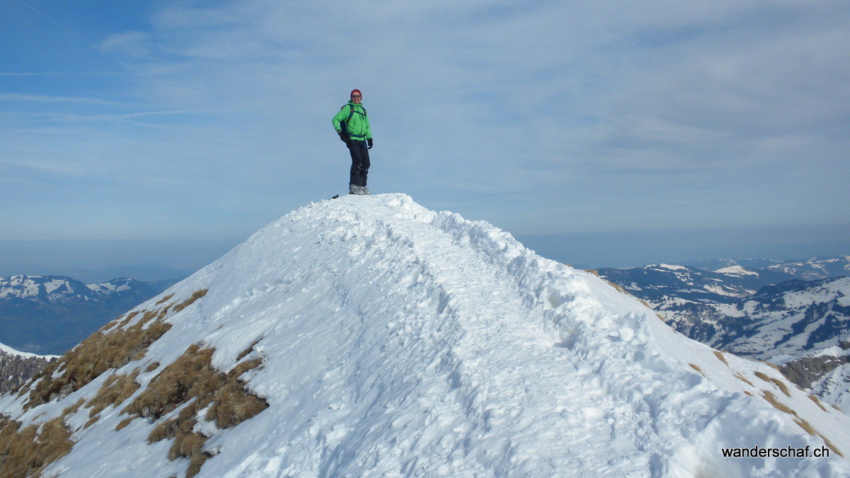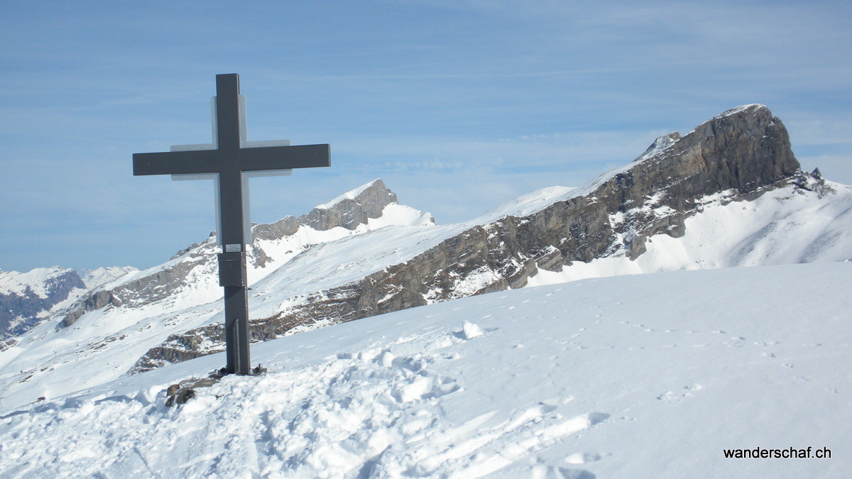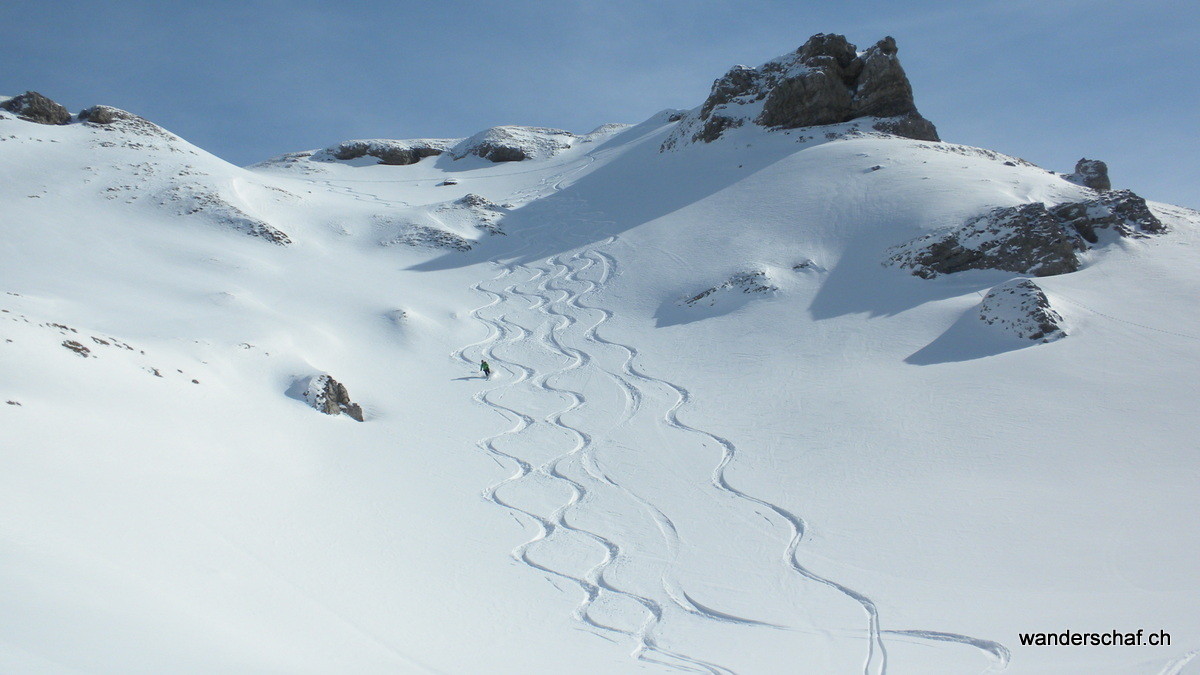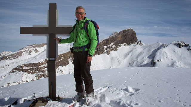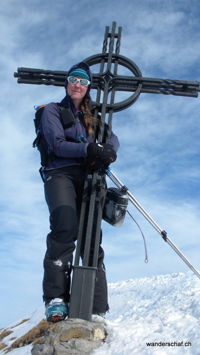 Hier heisst es nun nochmals Felle montieren und los. Die Wärme treibt uns die Schweisstropfen hervor doch schon nach einer Stunde stehen wir erfreut auf unserem 2. Gipfel, dem Hagelstock. Hier können wir sogar gemütlich eine Rast machen, denn der Wind hat nachgelassen und pfeift uns nicht mehr um die Ohren. Während ich so da sitze und die Wärme geniesse, wird unser Fenek schon vom nächsten kecken Gipfel in Bann gezogen. Also zotteln wir los…….mit den Fellen queren wir rüber und erreichen leicht und schmerzlos das Gipfelkreuz vom Siwfass. Welch ein Glück.....3. Gipfelerfolge bei super Wetter und unten wartet sogar noch ein wunderbarer, unverspurter Pulverhang auf uns. Genüsslich kurven wir bis Rotenbalm. Danach ist die Freude vorbei…..wir folgen den Abfahrtsspuren in einen erlenbewachsenen Graben. Wohl nicht ganz die optimale Abfahrtsroute. Konzentriert und in engen Kehren kämpfen wir uns um Bäume und Äste herum runter. Glücklicherweise erreichen wir heil oder nur wenig lädiert den Endpunkt in Chäppeliberg.