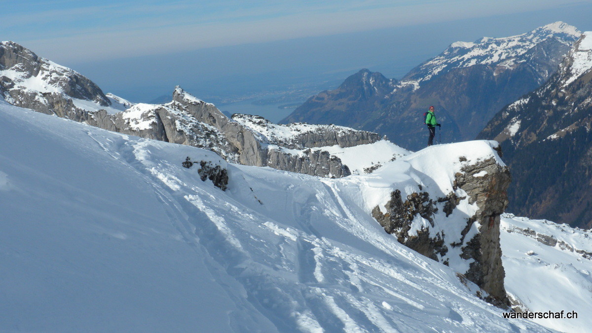 Zusammen mit dem „Füchsli“ geht’s heute in ein neues Revier zum Erforschen. Nach der spannenden Fahrt mit dem offenen Seilbähnli treffen wir auf ganz viele Fährten, welche uns zum Rossstock führen. Vom Skidepot aus geht’s zu Fuss auf den aussichtsreichen Gipfel, wo uns dann leider der Föhn mit seiner vollen Stärke begrüsst. Ausgesprochen kurz fällt somit auch die Gipfelrast aus. So schönes Wetter und schon nach Hause fahren!?....viel eher locken da die unbekannten Gipfel rund herum. Von Einheimischen erhalten wir dann noch Tipps und schon ist’s um uns geschehen. Ausgelassen suchen wir uns neben den vielen Abfahrtsspuren eine gute Route und finden sogar noch unverspurte Pulverhänge bis zum Spilauersee runter.