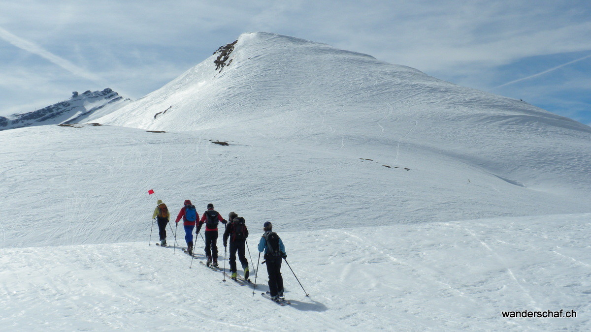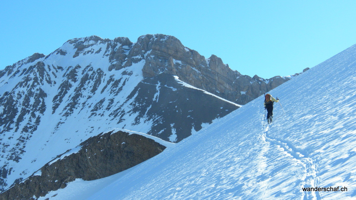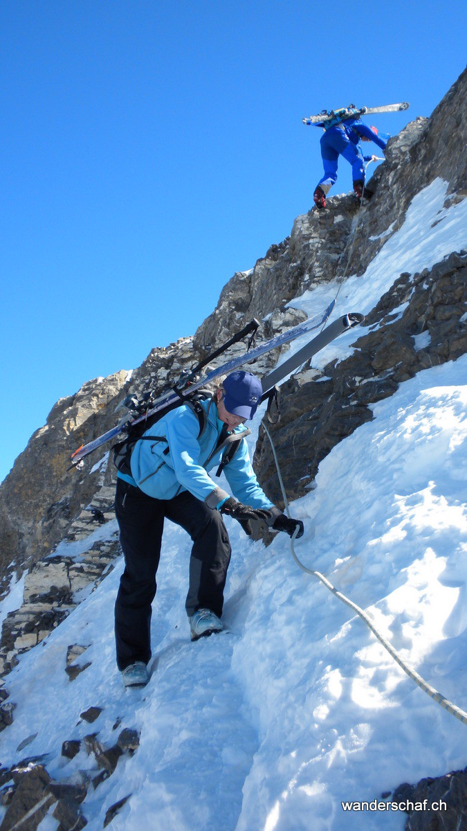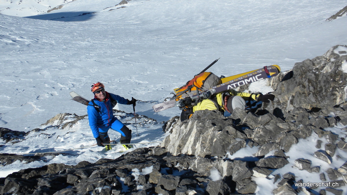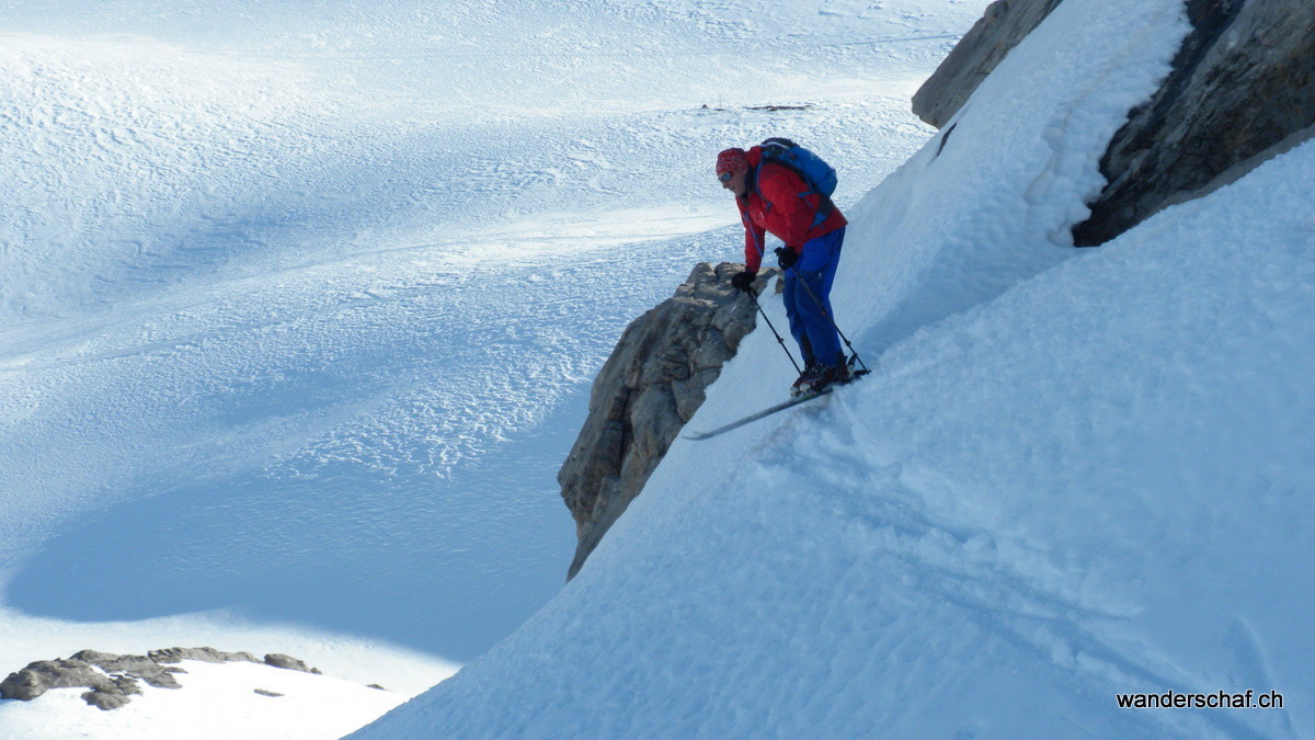 Heute geht’s nun wieder zu Viert los. Von der Cabane des Audannes kämpfen wir uns die steilen Hänge unterhalb vom Mont Pucel hoch um dann konzentriert Schritt um Schritt unterhalb der Felsen auf den Wildhorngletscher rüber zu traversieren. Auf dem Gletscher bläst uns wieder der starke Föhn unangenehm ins Gesicht. Doch wir geben nicht auf und steuern in die Lücke zwischen den zwei Wildhorngipfeln. Zu Fuss geht’s über den sehr ausgesetzten Grat auf den Hauptgipfel mit dem Kreuz 3‘246m. Der Aufsteig direkt über den Ostgrat wäre um einiges einfacher gewesen. Konzentriert steigen wir wieder ab zum Skidepot und erklimmen auch noch den anderen Gipfel, welcher mit 3‘248m ein klein wenig höher ist. Wegen dem blöden Wind fällt auch hier die Gipfelrast nur kurz aus. Auch der Schnee ist wegen dem Wind nicht richtig aufgesultz und es gibt eine ruppige Abfahrt über den Gletscher bis unterhalb vom Chilchli. Danach können wir in Südhänge rüber traversieren und doch noch einige Sulzkürvlein machen bevor wir in der Wildhornhütte ankommen. Peter und Katrin sind schon im Bier und erwarten uns auf der Sonnenterrasse. Mit dem Wind wird’s kühl und statt Ruedi