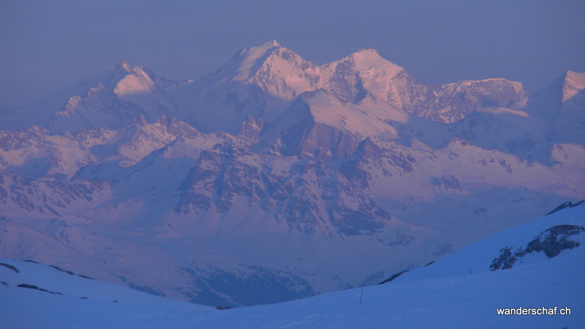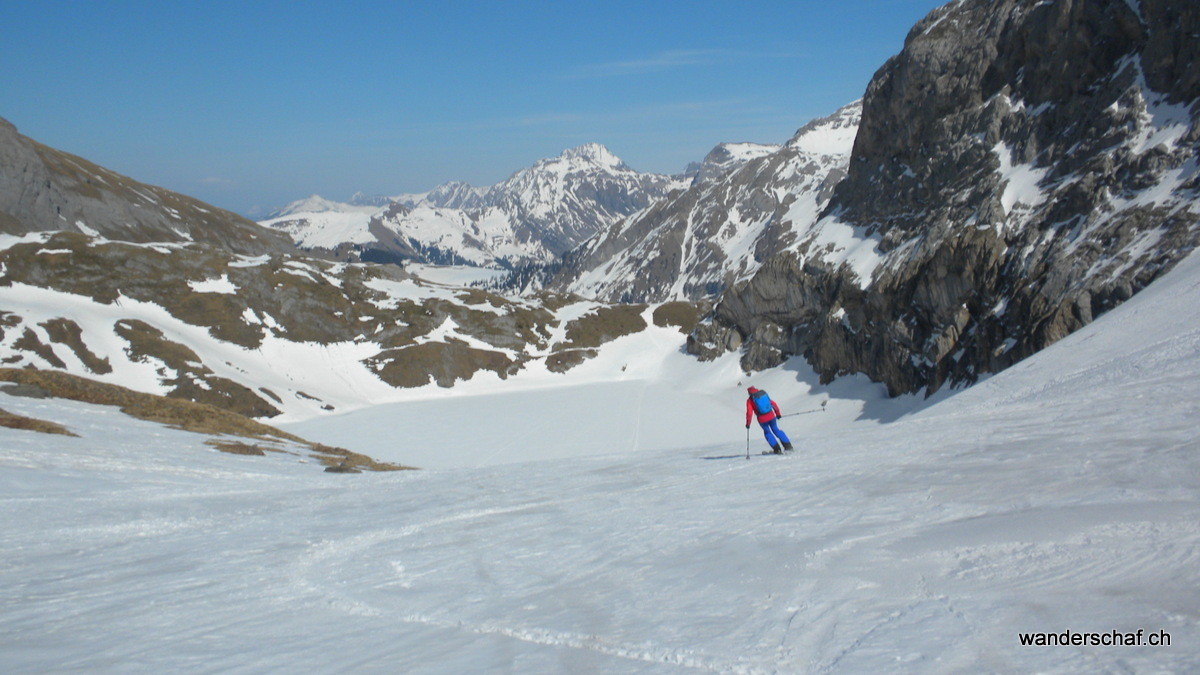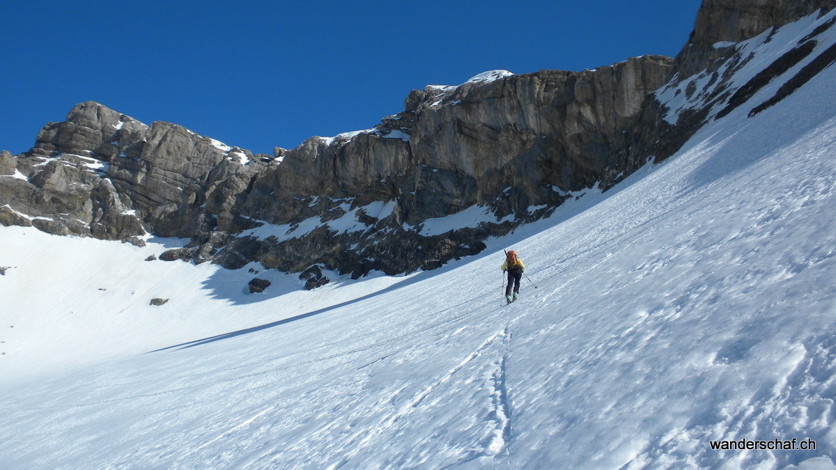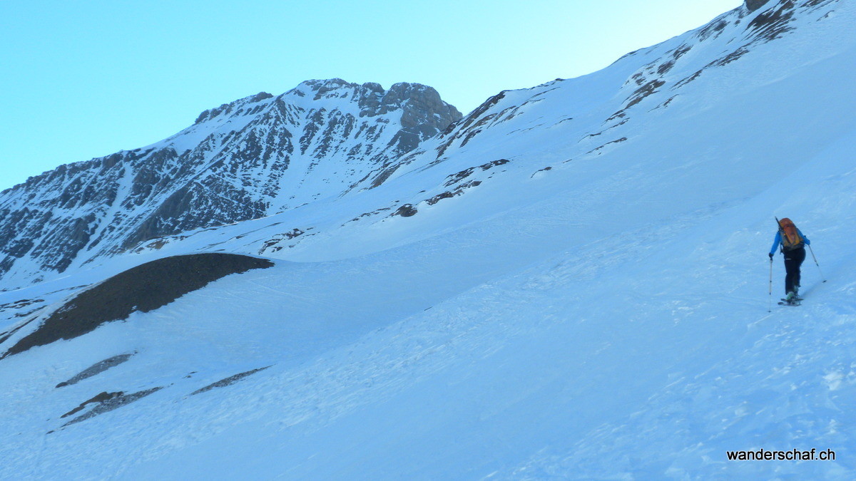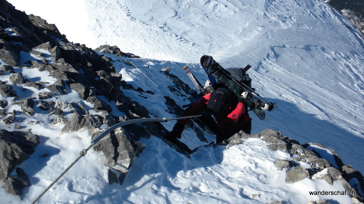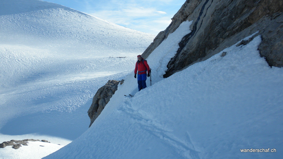 Heute geht’s nun wieder zu Viert los. Von der Cabane des Audannes kämpfen wir uns die steilen Hänge unterhalb vom Mont Pucel hoch um dann konzentriert Schritt um Schritt unterhalb der Felsen auf den Wildhorngletscher rüber zu traversieren. Auf dem Gletscher bläst uns wieder der starke Föhn unangenehm ins Gesicht. Doch wir geben nicht auf und steuern in die Lücke zwischen den zwei Wildhorngipfeln. Zu Fuss geht’s über den sehr ausgesetzten Grat auf den Hauptgipfel mit dem Kreuz 3‘246m. Der Aufsteig direkt über den Ostgrat wäre um einiges einfacher gewesen. Konzentriert steigen wir wieder ab zum Skidepot und erklimmen auch noch den anderen Gipfel, welcher mit 3‘248m ein klein wenig höher ist. Wegen dem blöden Wind fällt auch hier die Gipfelrast nur kurz aus. Auch der Schnee ist wegen dem Wind nicht richtig aufgesultz und es gibt eine ruppige Abfahrt über den Gletscher bis unterhalb vom Chilchli. Danach können wir in Südhänge rüber traversieren und doch noch einige Sulzkürvlein machen bevor wir in der Wildhornhütte ankommen. Peter und Katrin sind schon im Bier und erwarten uns auf der Sonnenterrasse. Mit dem Wind wird’s kühl und statt Ruedi