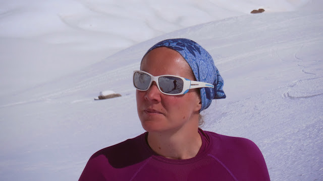 Um 6.00Uhr gibt’s Frühstück damit wir zeitig losmarschieren können. Wir haben einen langen Aufstieg von der Geltenhütte 2‘003m bis zum Col du Brochet / Gältelücke 2‘753m vor uns. Danach folgt noch der anstrengende Kessel unterhalb dem Mont Pucel. Der starke Föhn bläst und rüttelt an uns so dass ich zeitweise das Gefühl habe, kaum weiter zu kommen. Doch immer noch richtig im Zeitplan erreichen wir die Südwand vom Mont Pucel. Während einer kurzen Rast nehmen wir Kontakt auf mit unseren Liebsten, welche uns mit dem Feldstecher vom Glacier du Wildhorn aus beobachten. Die Sonne brennt stark in den Hang und wir wollen so rasch wie möglich aus diesen steilen Hängen raus. Oben ist’s noch nicht so toll zum Fahren doch weiter unten kurven wir durch schöne Sulzhänge und steuern auf die Cabane des Audannes 2‘508m zu. Zeitgleich erreichen unsere Männer die Cabane. Sie sind gestern gemütlich von der Iffigenalp in die Wildhornhütte aufgestiegen und heute über den Glacier du Wildhorn rüber in die Cabane des Audannes gekommen. Mit einem Bier wird auf die Wiedervereinigung angestossen.