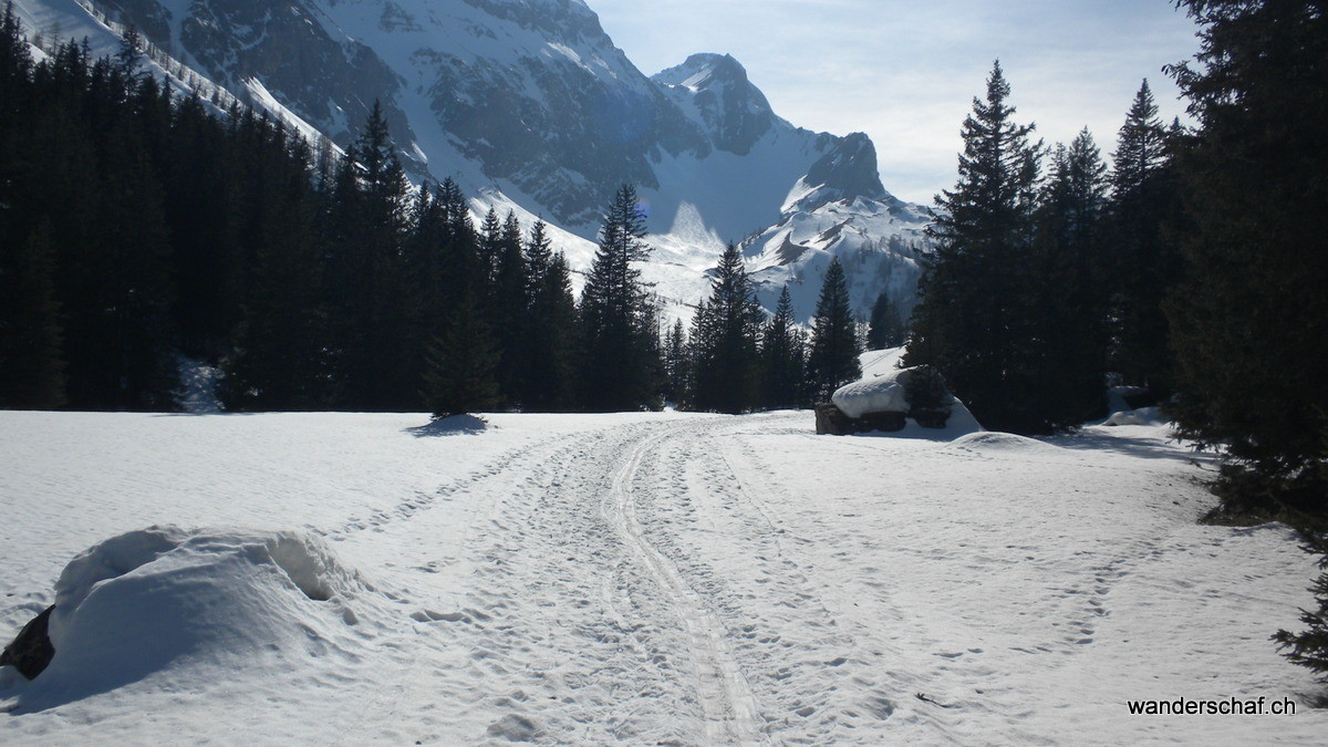 , dem Hüttengehilfen beim Schneeräumen auf der Terrasse nur zuzuschauen, packen wir kurzerhand mit an. Die Lawinenschaufel tut gute Dienste und wir kriegen so richtig Warm und auch wieder Durst. Diesen löschen wir noch bevor wir durch die nun aufgesulzten Hänge via Iffigensee zur Iffigenalp zurück kurven. Viel zu schnell sind wir unten so, dass wir noch einige Zeit auf den organisierten Bus nach Pöschenried warten müssen.