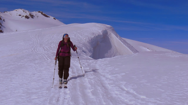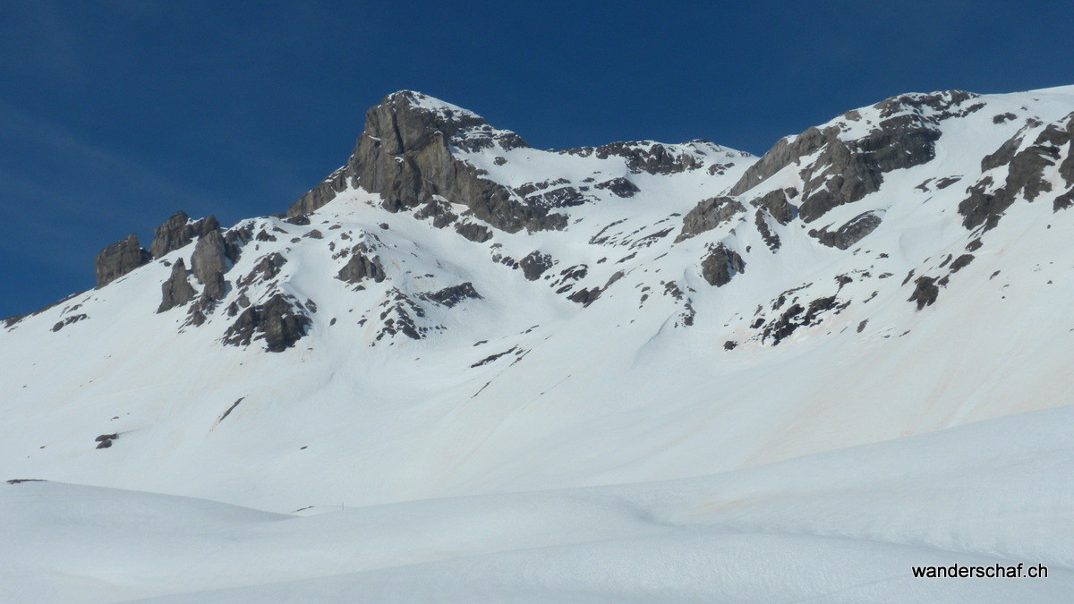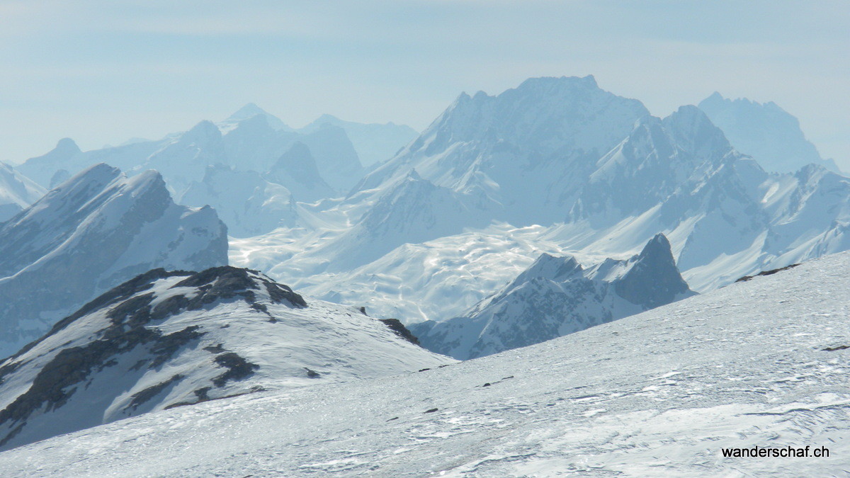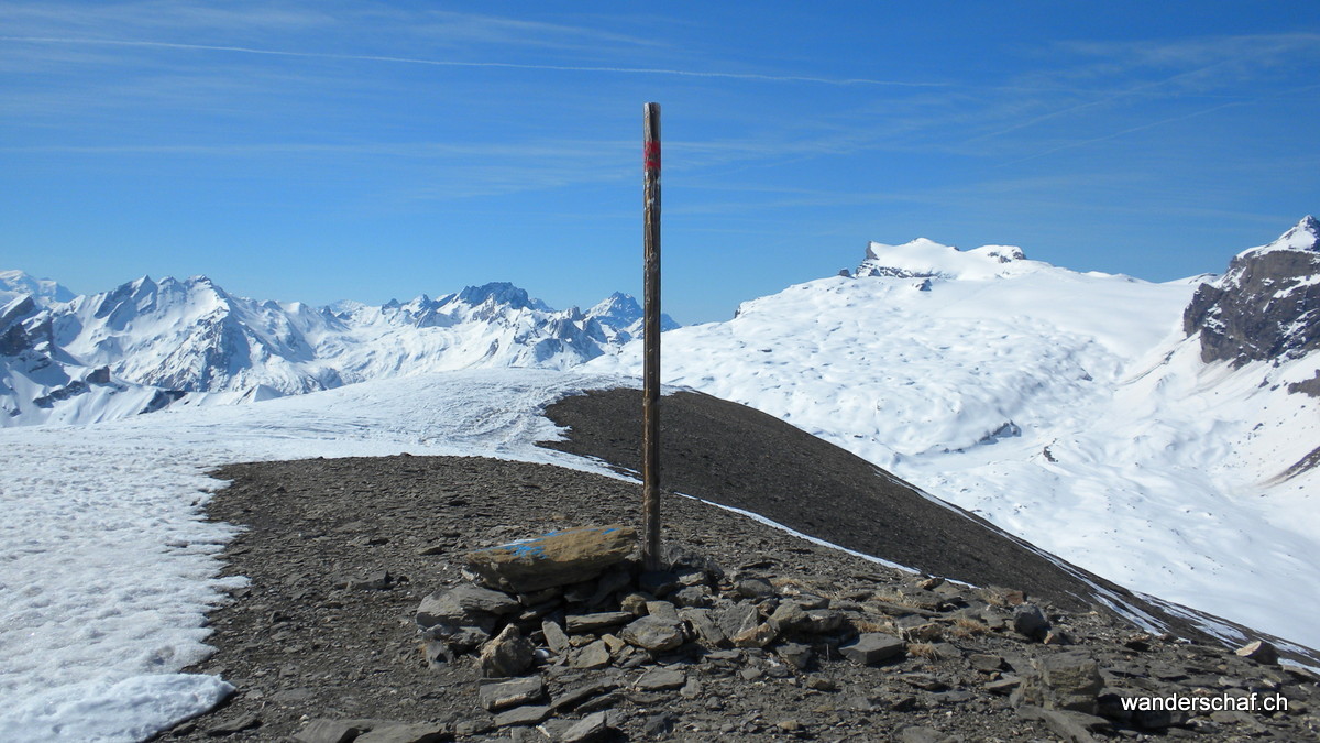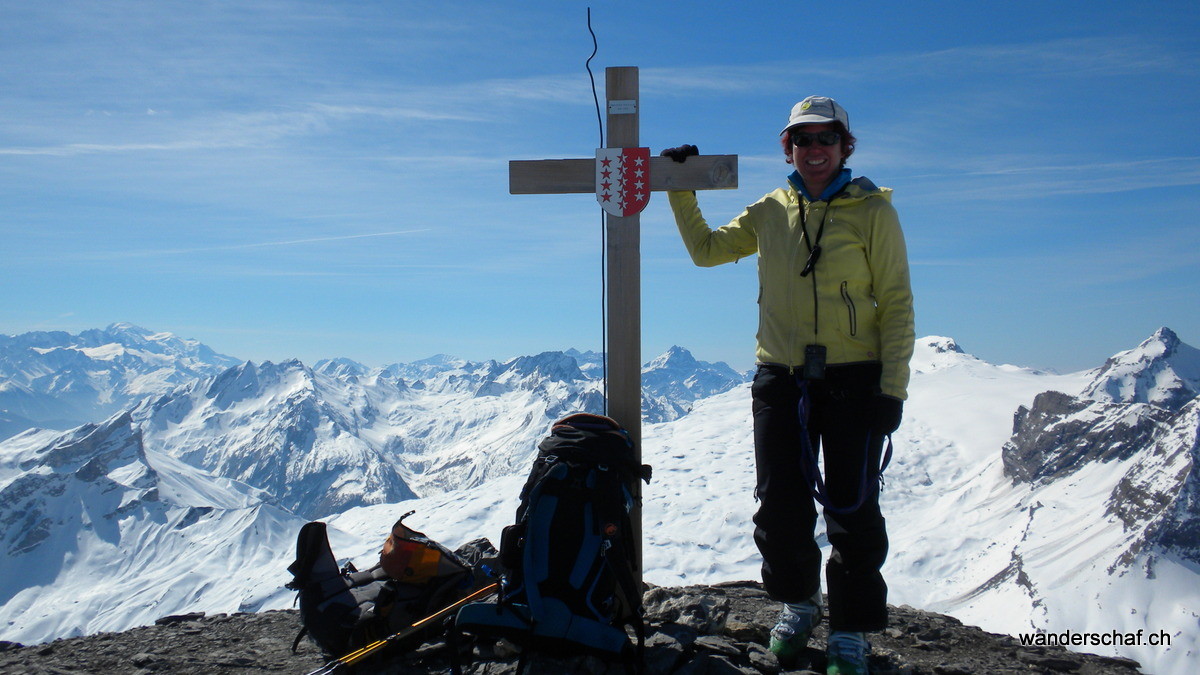 Katrin und ich werden von unsern netten Herren auf den Col du Pillon chauffiert, so dass wir mit der ersten Bahn gleich auf den Glacier 3000 hochfahren können. Sogleich folgt die lange, anstrengende Abfahrt über den ruppigen Glacier de Tsanfleuron auf den Col du Sanetsch 2‘252m runter. Nun endlich können wir anfellen und über die Arête de l’Arpille den Aufstieg in Angriff nehmen. Nach den ersten 200 Höhenmetern folgen immer wieder apere Stellen und wir beschliessen die Skier auf den Rucksack zu binden. So kommen wir dank dem guten Trittschnee auch in den Passagen mit Schnee gut vorwärts. Unterhalb des Felsaufbaus bei Punkt 2‘823 finden wir nun wieder eine durchgehende Schneedecke vor. Durch die Südflanke erreichen wir dann bald einmal den steilen Gipfelhang vom Arpelistock. Dank der vorhandenen guten Spur und noch gerade genügend Schnee geht’s flott rauf zum Arpelistock 3‘036m.
