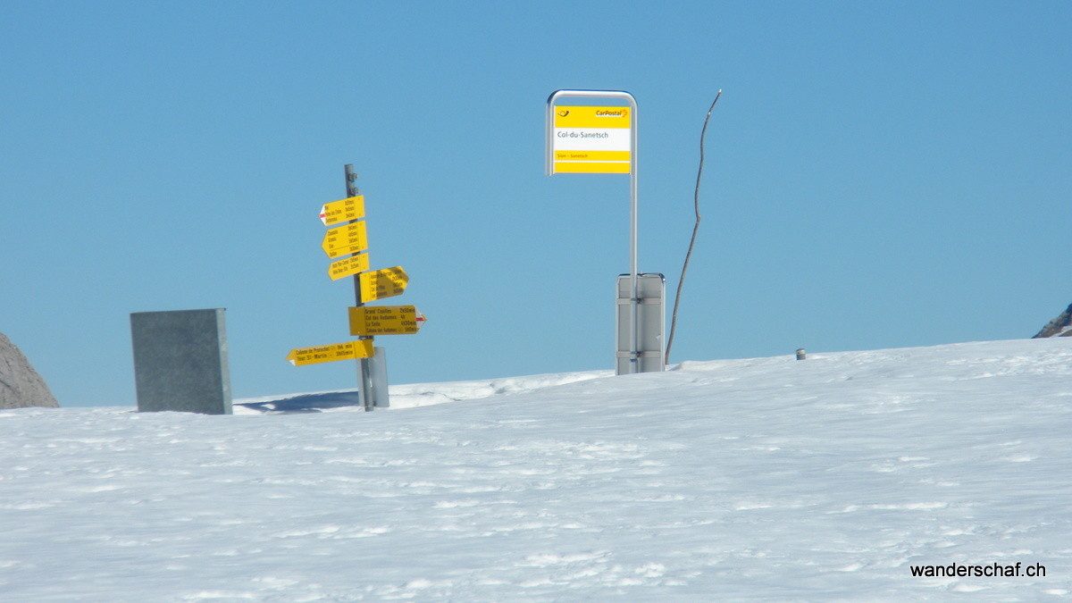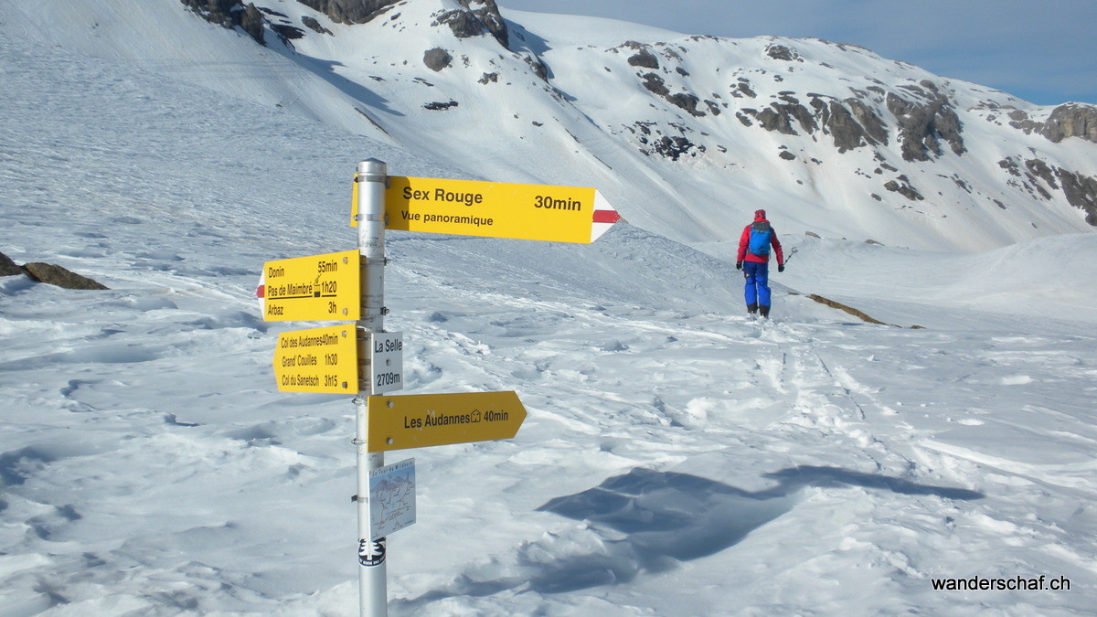 Da wir gestern bei unserem Diablerets Besuch den abgeblasenen und steilen Aufstieg zum Oldenhorn begutachtet haben, will nun heute niemand von uns dort rauf. Wir suchen uns ein anderes gemütlicheres Tüürli aus. Vom Col du Pillon 1‘546m steigen wir entlang vom frisch präparierten Winterwanderweg via Lac Retaud nach la Marnèche. Zu unserem Erstaunen sind die Skilifte noch in Betrieb und wir beschliessen uns dies zu Nutze zu machen. Nach kurzem Verhandeln mit dem Liftangestellten lassen wir uns vom Tellerlilift bis unterhalb vom Floriette Gipfel transportieren. Nun folgt eine kurze Abfahrt in den Col des Andérets, wo wir die Felle wieder montieren. Rasch stehen wir nun auf dem Gipfel von la Palette 2‘170m, wo wir trotz starkem Wind eine Mittagsrast einlegen.