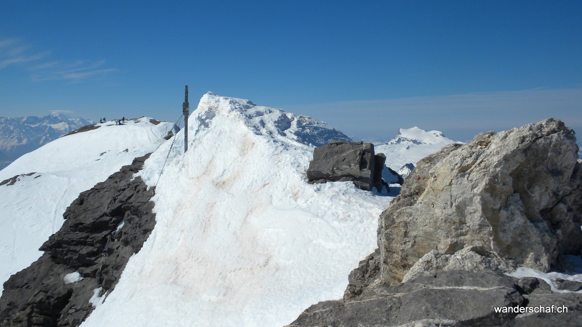 Glücklicherweise hat sich jemand geopfert und mir den eingeteilten Dienst abgenommen. So konnte ich gestern nach dem Sonntagsdienst zu meinen Tourenkollegen anreisen und mich heute auf der gemeinsamen Tour akklimatisieren. Für 27.—CHF lassen wir uns von der Seilbahn ab Col du Pillon zur Bergstation Sex Rouge auf 2‘940m hochhieven. Nach der kurzen Abfahrt über die Pisten wird angefellt und ganz gemütlich losmarschiert. Bei der Schlüsselstelle am le Dôme müssen wir die Skier auf den Rucksack aufbinden damit wir diese heikle, glücklicherweise mit Seilen gesicherte Feslpassage runterklettern können. Nur die Höhe macht uns noch etwas zu schaffen und lässt unser Herz schneller schlagen sonst geht’s ohne Probleme weiter über den Glacier des Diablerets zum Sommet des Diablerets 3‘210m. Hier können wir bei angenehmen Temperaturen die herrliche, wolkenlose Rundsicht geniessen.