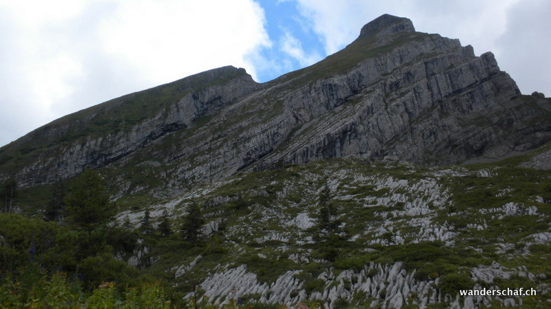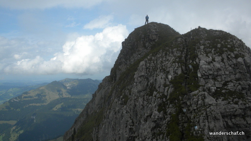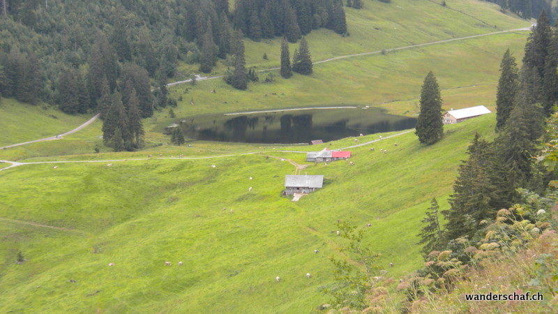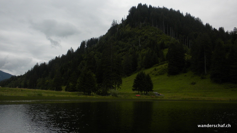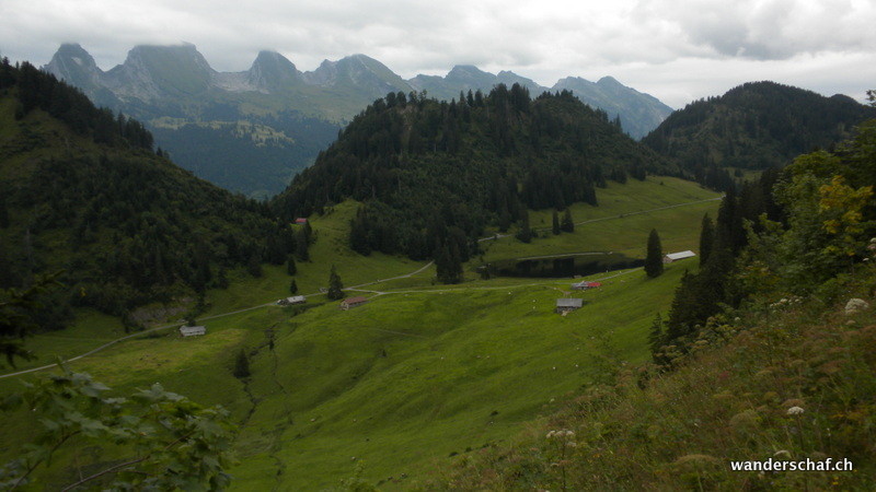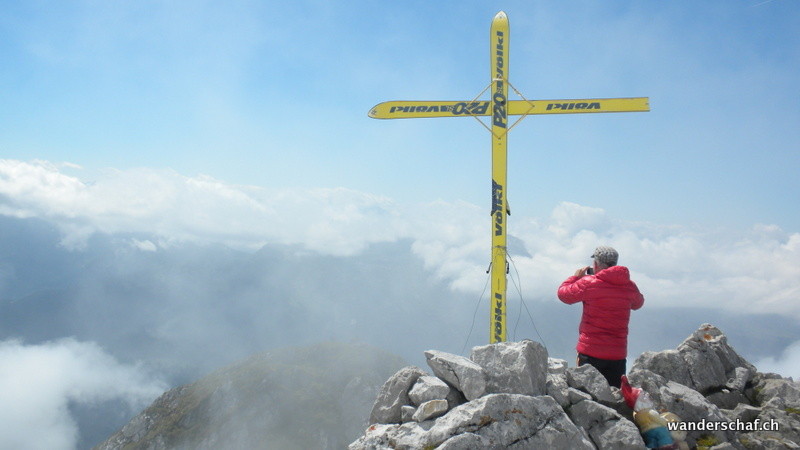 Auch heute ist das Wetter nicht sehr gut....wenigstens ist der Nebel teilweise verschwunden und wir sehen etwas von der Umgebung. Der Aufstieg zum Silberplatten-Gipfel erweist sich als erstaunlich einfach und glücklich stehen wir oben. Doch nicht lange... ein kühler Wind bläst uns um die Ohren und die Wolken versprechen nicht Gutes. Nichts wie runter! Doch der erwartete Regen zeigte sich nur in einigen wenigen Tropfen. Beim Stosssattel angelangt, wagen wir eine Besteigung vom Stoss. Dieses Unterfangen brechen wir jedoch wegen der Nässe und Ausgesetztheit ab und steigen oder rutschen über die schmierige Schafweide via Lauchwis runter nach Schrenit. Das Wetter wird immer besser und wir entscheiden spontan den abwechslungsreichen „Höhenweg“ via Mutteli zum Gräppelensee zu begehen. Durch die Chrinn steigen wir danach noch ab bis Alt St. Johann.