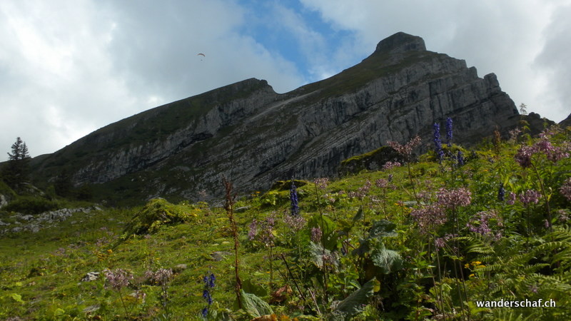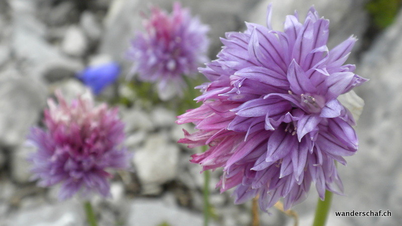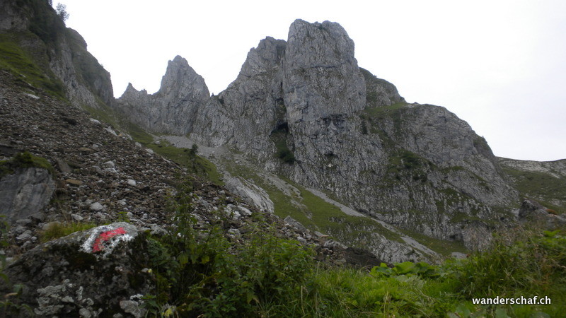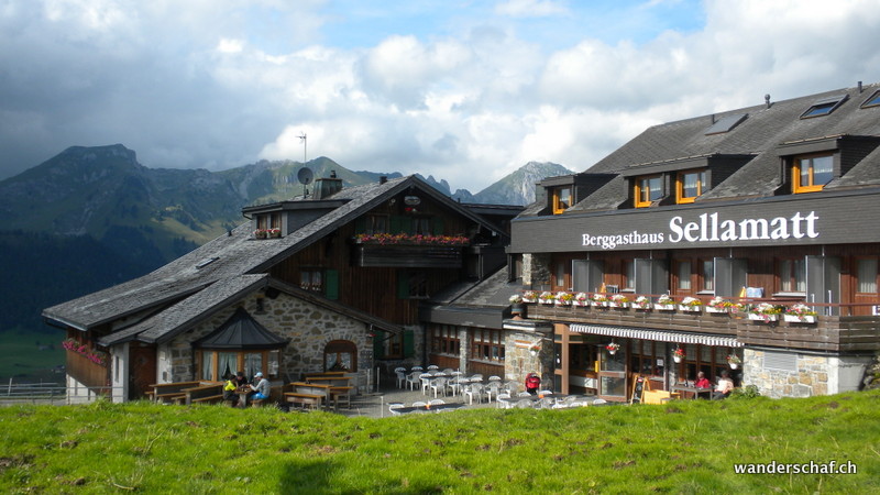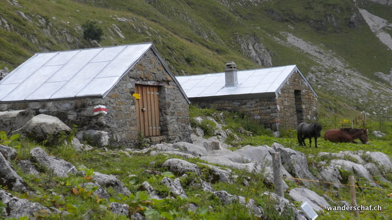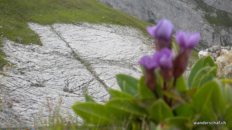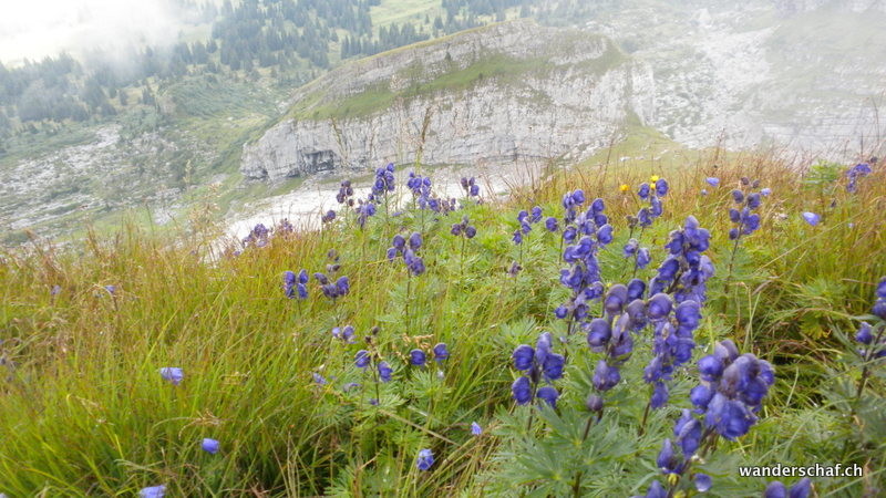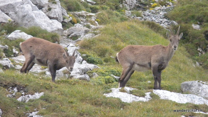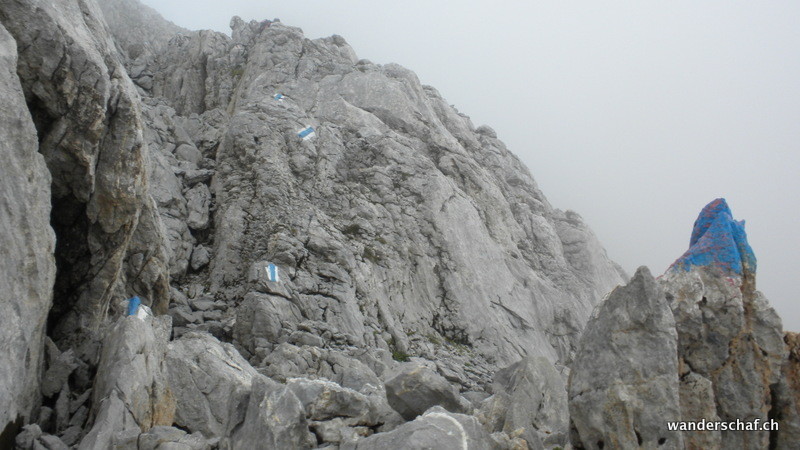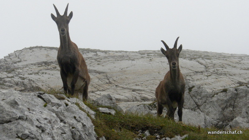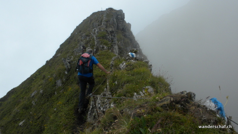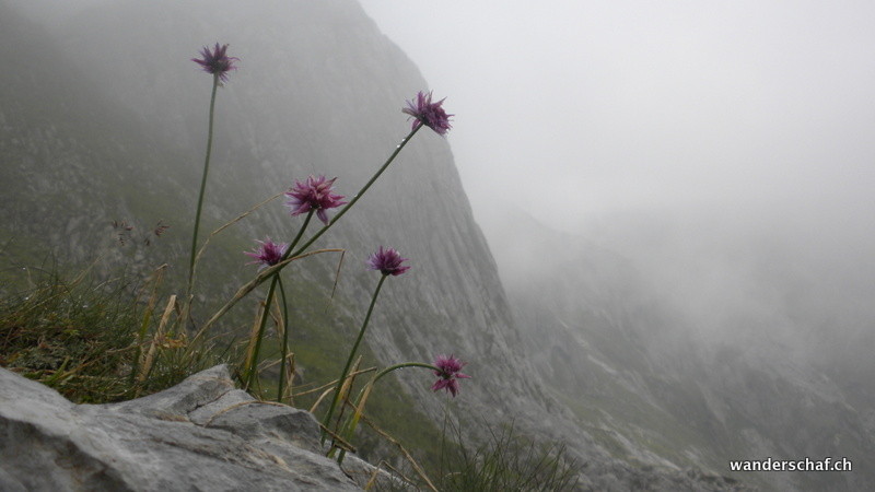 Nach dem gemütlichen Aufstieg auf das Aussichtsplateau nach Gamplütt folgt noch ein kurzer, abwechslungsreicher Aufstieg zum Schafhüttli. Danach gibt’s einen Grasbeisser Aufstieg.....steil und kaum endend geht’s durch schmierige Schafweiden hoch. Der Ausblick vom Wildhuser Schafberg wäre irrsinnig.....wir jedoch kriegen nur ab und zu etwas von der Szenerie mit wenn die Wolken aufreissen. Es folgt ein steiler Abstieg in die Geröllhalde um dann etwas mühsam auf der anderen Seite wieder zum Jöchli hoch zu steigen. Die Alpinroute führt uns sehr abwechslungsreich und einfach über den Nädligergrat. Leider hüllt uns auch hier der Nebel ein....einzig der blühende Schnittlauch und andere Blümchen bringen etwas Farbe ins Nebelgrau. Die vielen Steinböcke, welche unten bei der Zwinglipasshütte zu Hause sind, können wir in der Ferne hören......tönt fast beängstigend wie sie immer ihre Hörner zusammenknallen. Beinahe anspruchsvoller empfinde ich dann den steilen und ausgesetzten, glücklicherweise sehr gut mit Seilen abgesicherten Abstieg vom Altmannsattel zur Rotsteinpasshütte. Für heute Nacht quartieren wir uns hier ein und können sogar nach dem feinen Nachtessen noch mit unseren Tischnachbarn aus Vättis einen Jass klopfen. Vielen Dank nochmals, dass wir uns nicht mit Schilten, Rosen, Eicheln und Schellen rumschlagen mussten!