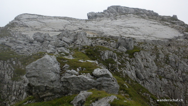 In der Nacht hat’s teilweise wie aus Kübeln gegossen und auch beim Morgenessen regnet’s fast ununterbrochen. Wir warten ab......und plötzlich kommt zögerlich blauer Himmel und es trocknet ab. Dank unserer Geduld und den konsultierten Wetterradar-Apps können wir den schönen, teilweise sehr ausgesetzten Lisengrat bei Sonnenschein und guter Sicht begehen. Zeitgleich mit unserer Ankunft beim Säntis hat’s auch der Nebel wieder geschafft und wir sehen nichts. Lange harren wir in der gemütlichen Gaststube vom alten Säntis aus. In der Hoffnung, dass sich der Nebel erneut etwas lichten würde. Doch diesmal ist die Geduld vergebens. Wir schauen uns noch die schöne Mineralienausstellung an bevor wir den Abstieg in Angriff nehmen. Durch den Stollen gelangen wir in die klettersteigähnlich eingerichtete Felspassage unterhalb der Ban. „Gfürchig“ steil geht’s runter und glitschig ist’s auch. Voll konzentriert erreichen wir einfacheres Gelände und geniessen die Heimatgefühle im Karstgebeit beim Graukopf. Unglaublich welch steinernes Meer wir hier antreffen.....all die kleinen Muscheln und Fossilien. In der Tierwis ist nicht viel los......zum Glück gibt’s viele interessante Literatur und bald schon ein warmes Bett ;o)