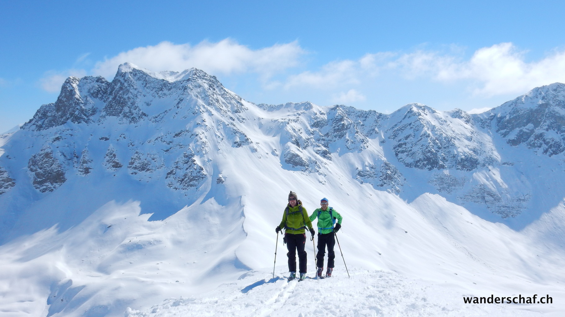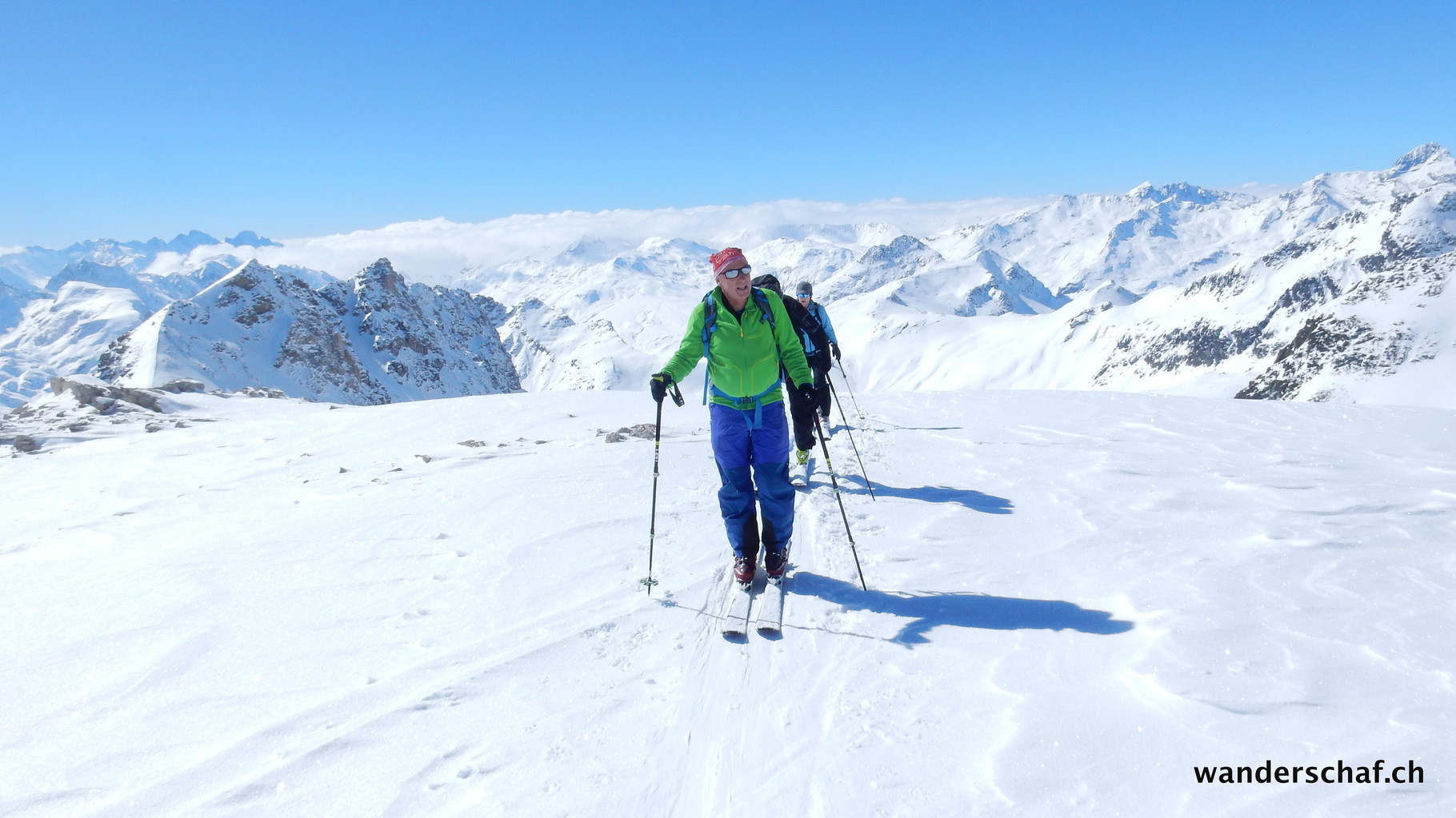 Wir wollen heute noch einmal einen Versuch starten Richtung Piz Turba. Was im Nebel noch furchterregend erschien, sieht bei guter Sicht gar nicht mehr schlimm aus. Doch der Weg zum Piz Turba zieht sich ziemlich in die Länge und oben am Grat werden wir vom starken Westwind fast weggepustet! Zu Fuss geht's auf einer guten Spur dem ausgesetzten Grat entlang zum Gipfel um nach dem Gipfelfoto gleich wieder den Rückzug an zu treten.